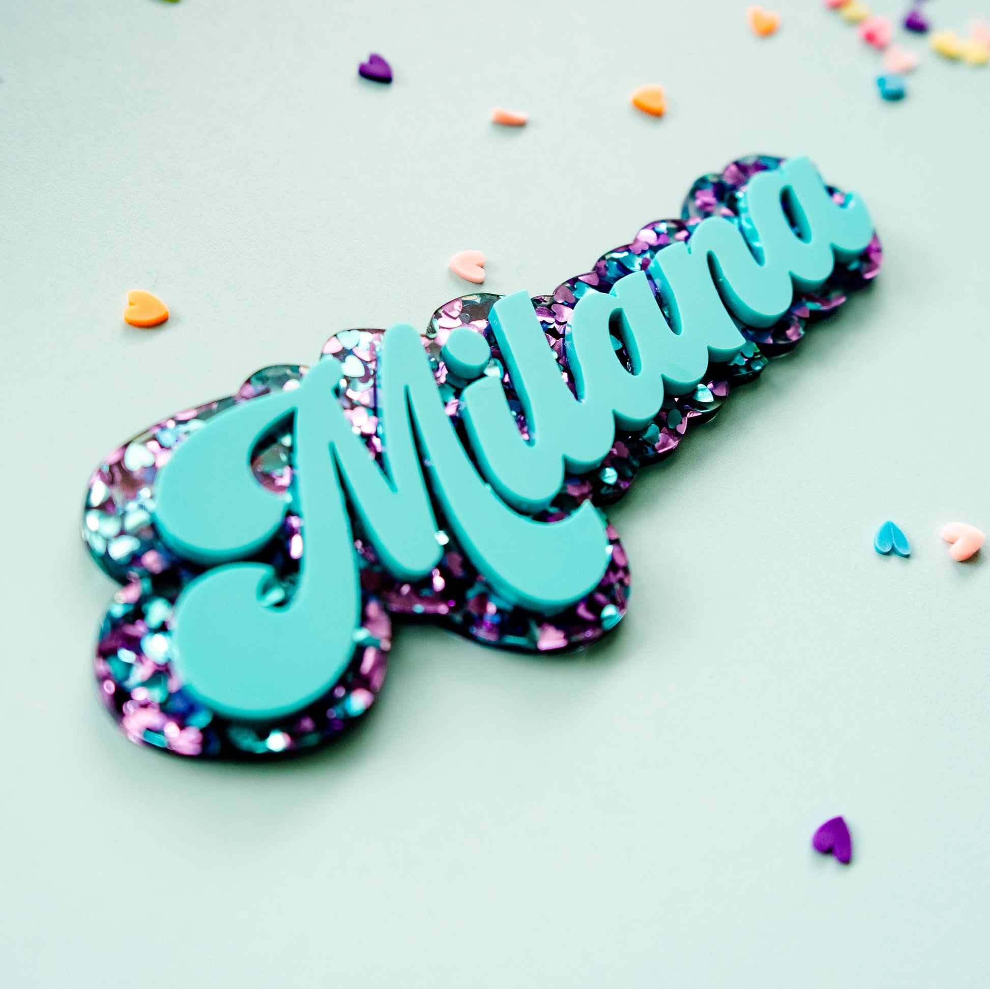 Sparkle and shine with our fabulous two-layer acrylic name tag, featuring a dreamy combination of glitter hearts and matte turquoise!
