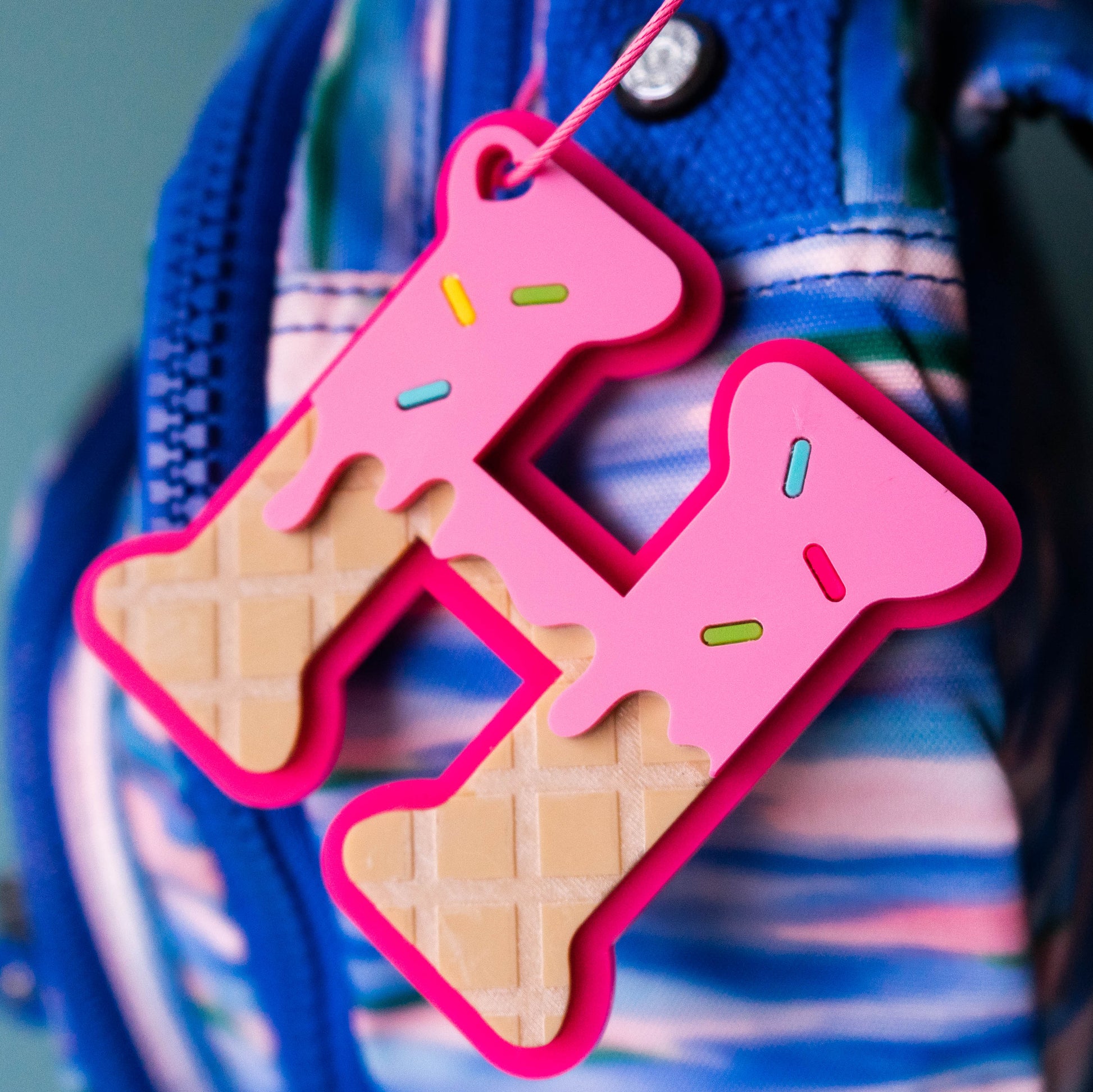 Add a sprinkle of fun to your bag with this handmade acrylic letter tag! Designed to look like a waffle cone topped with melting ice cream and colorful sprinkles, each tag is personalized with the letter of your choice.